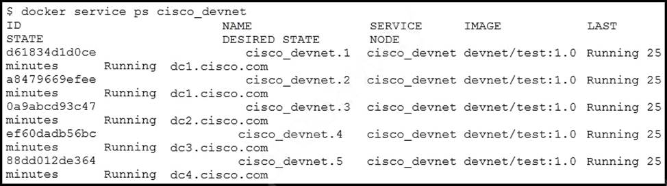 The cisco_devnet Docker swarm service runs across five replicas. The development team tags and imports a new image named devnet/ test:1.1 and requests that the image be upgraded on each container. There must be no service outages during the upgrade process.