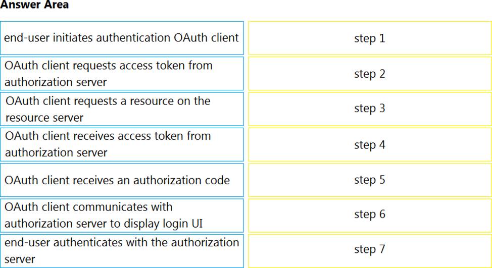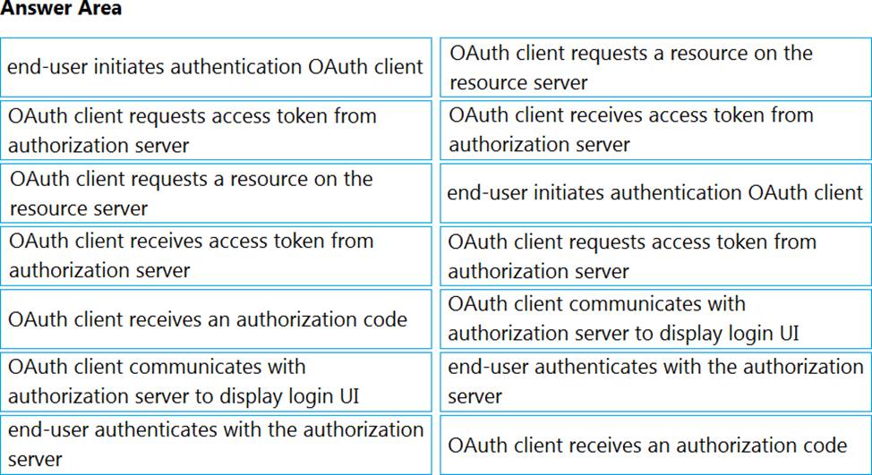 Drag and drop the steps on the left into the order on the right for an end-user to access an OAuth2 protected resource using the ‘Authorization Code Grant’ flow.