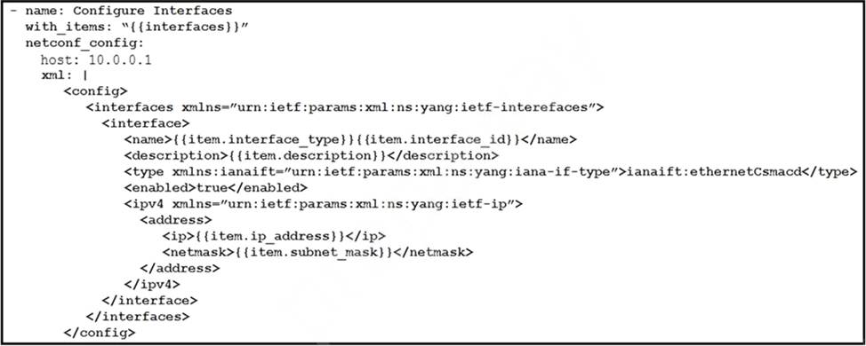 The Ansible playbook is using the netconf_module to configure an interface using a YANG model.