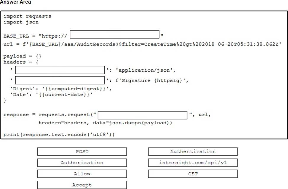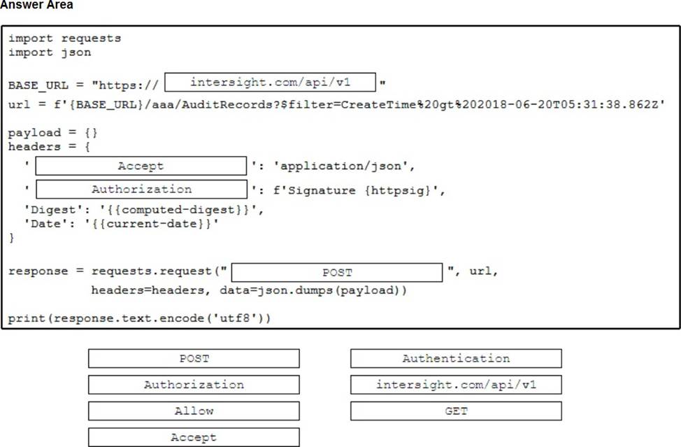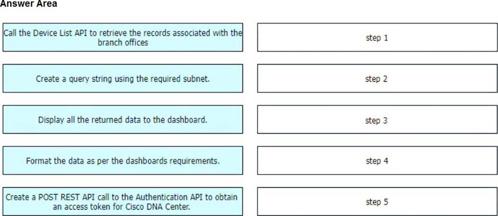 Drag and drop the steps from the left into the order on the right to provide a custom dashboard to display the version of code that is installed in a network subnet using the Cisco DNA Center API.