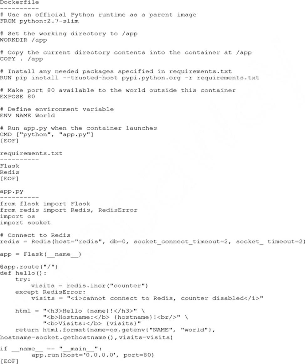 The command docker build –tag=friendlyhello . is run to build a docker image from the given Dockerfile, reguirements.txt, and app.py. Then the command docker run -p 4000:80 friendlyhello is executed to run the application.