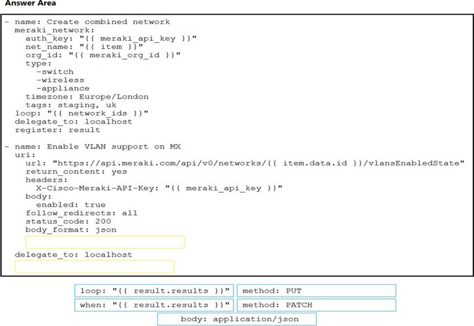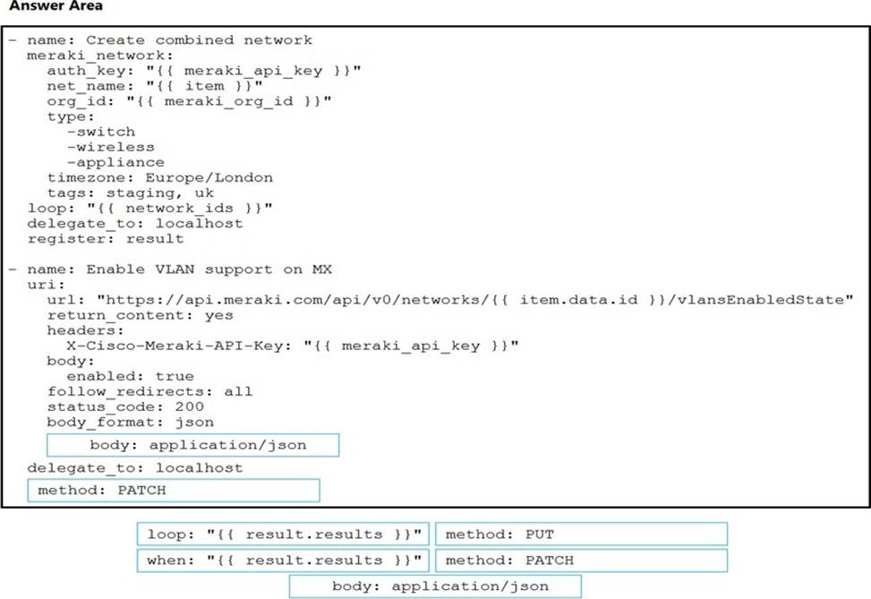 Drag and drop the code from the bottom onto the box where the code is missing on the Ansible task to enable a VLAN on a Meraki MX device. Not all options are used.