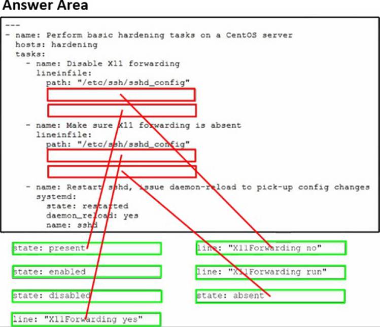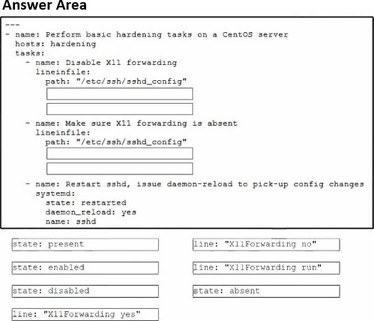 Drag and drop the code snippets from the bottom onto the blanks in the code to disable X11Forwarding on the SSH service of a CentOS server. Not all options are used.