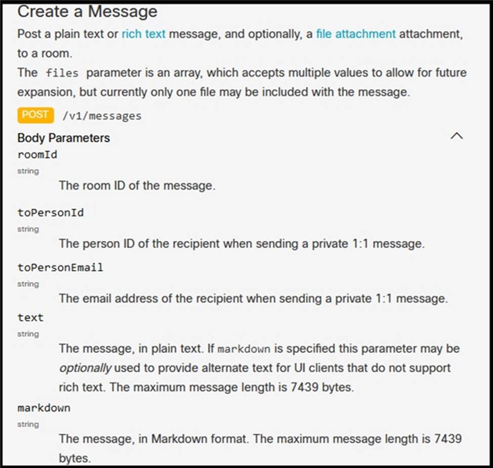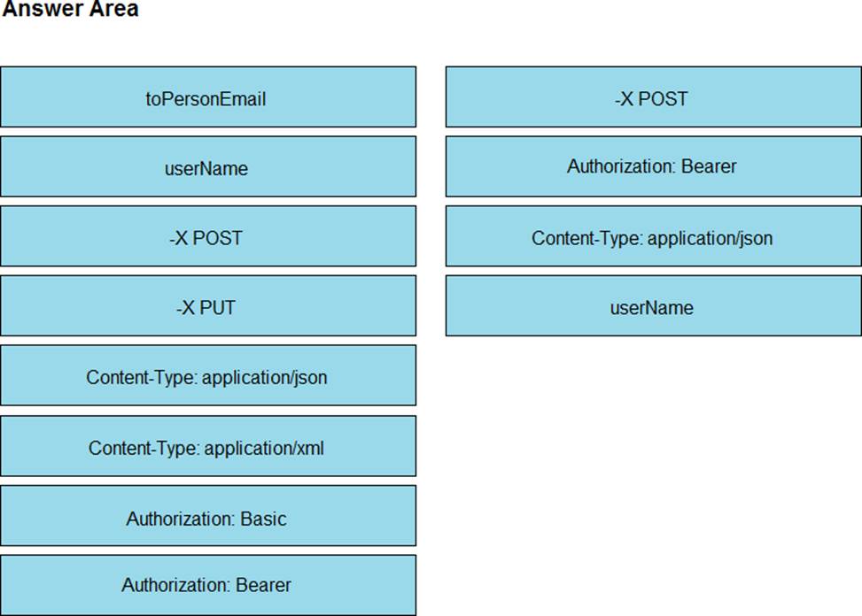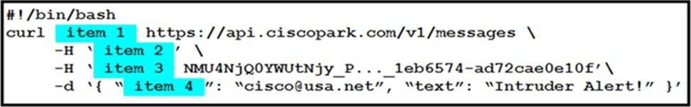 Drag and drop the code snippets from the left onto the item numbers on the right that match the missing sections in the exhibit to create a chat-ops script that will notify of alarms via the Webex REST API. Not all code snippets are used.