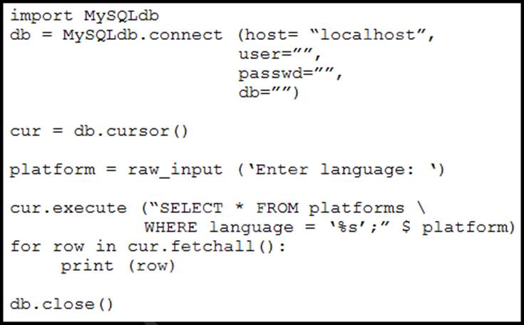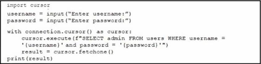 A network engineer writes Python code for a web application to query an SQL database. The code is vulnerable to SQL injection attacks.