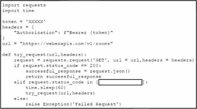An engineer creates a function that gathers information from the Cisco Webex RESTful API. To enable increased durability, the engineer needs to implement a retry mechanism that pauses the script and retries the request if specific response codes are received.