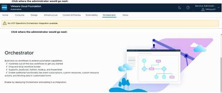 In VMware Cloud Foundation (VCF) 9.0, the VCF Operations Orchestrator (formerly vRealize Orchestrator) is a separate functional engine that must be explicitly integrated into the automation framework. When an administrator selects the Orchestrator tab and encounters the warning message "No VCF Operations Orchestrator integration available," it indicates that the logical link between the Automation service and the Orchestrator appliance has not yet been established for that specific organization.