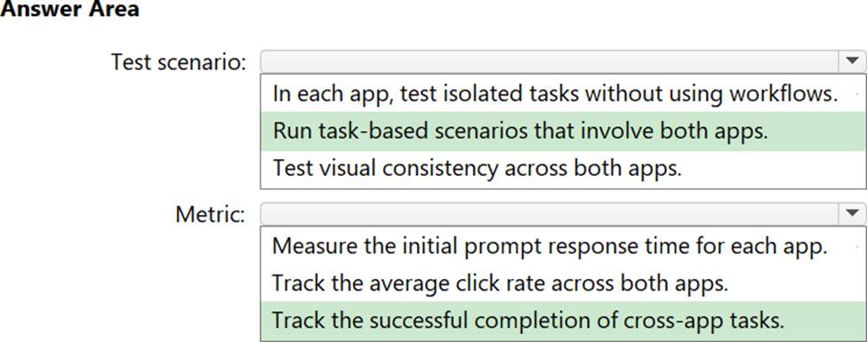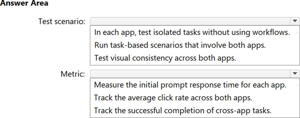 Which test scenario and metric should you include in the design? To answer, select the appropriate options in the answer area. NOTE: Each correct selection is worth one point.