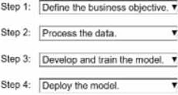 Sated and order the steps from the following bat to correctly describe the ML Lifecycle for a new custom modal Select each step one time. (Select and order FOUR.)