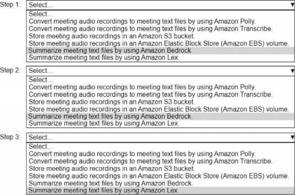 Convert meeting audio recordings to meeting text files by using Amazon Polly. Amazon Polly is a text-to-speech service, not for converting audio to text. This option is incorrect and not used.
