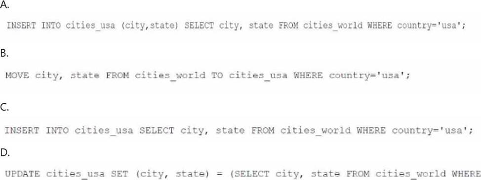 Option A: INSERT INTO cities_usa (city, state) SELECT city, state FROM cities_world WHERE country=’usa’;This statement inserts only the cities and states where the country column has a value of ‘usa’ from the cities_world table into the cities_usa table. This is a correct approach to create a new table with data filtered from an existing table in Athena.