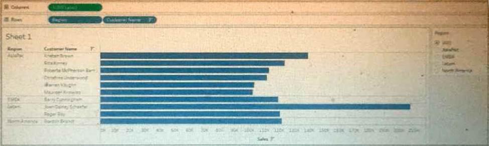A business analyst is creating a view of the top 10 customers for each region. The analyst has set a "Top 10" filter on Customer Name.