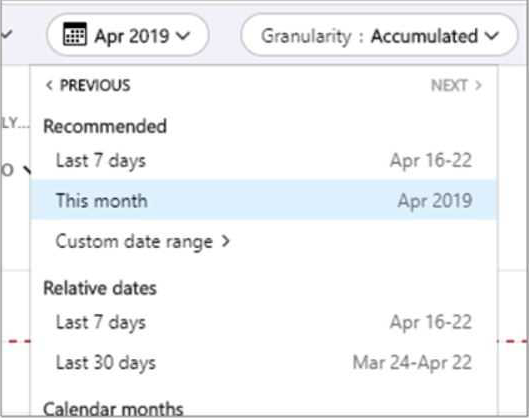 Cost analysis shows data for the current month by default. Use the date selector to switch to common date ranges quickly. Examples include the last seven days, the last month, the current year, or a custom date range. Pay-as-you-go subscriptions also include date ranges based on your billing period, which isn’t bound to the calendar month, like the current billing period or last invoice. Use the <PREVIOUS and NEXT> links at the top of the menu to jump to the previous or next period, respectively. For example, <PREVIOUS will switch from the Last 7 days to 8-14 days ago or 15-21 days ago.