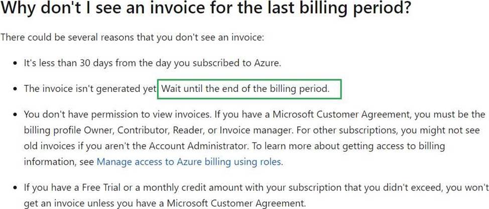 Invoices can only be used for past billing periods not for current billing period, i.e. if your requirement is to know the last week’s cost then that also not filled by invoices because Azure generates invoice at the end of the month. Even though Invoices have custom timespan, but when you put in dates for a week, the pane would be empty.