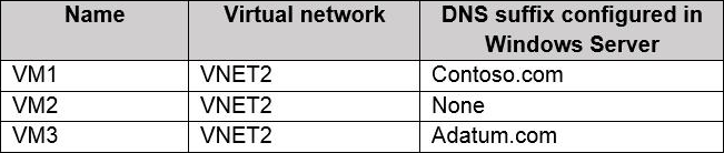 All three VMs are in VNET2. Auto registration is enabled for private Azure DNS zone named contoso.com, which is linked to VNET2. So, VM1, VM2 and VM3 will auto-register their host records to contoso.com.