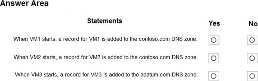 None of the VM will auto-register to the public Azure DNS zone named adatum.com. You cannot register private IPs on the internet (adatum.com)