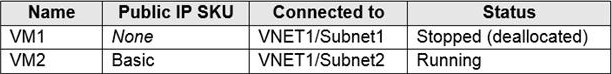 Solution: You create a Basic SKU public IP address, associate the address to the network interface of VM1, and then start VM1.