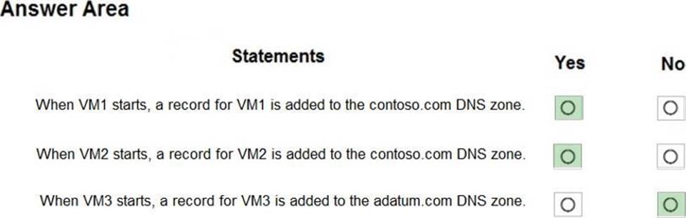 None of the VM will auto-register to the public Azure DNS zone named adatum.com. You cannot register private IPs on the internet (adatum.com)