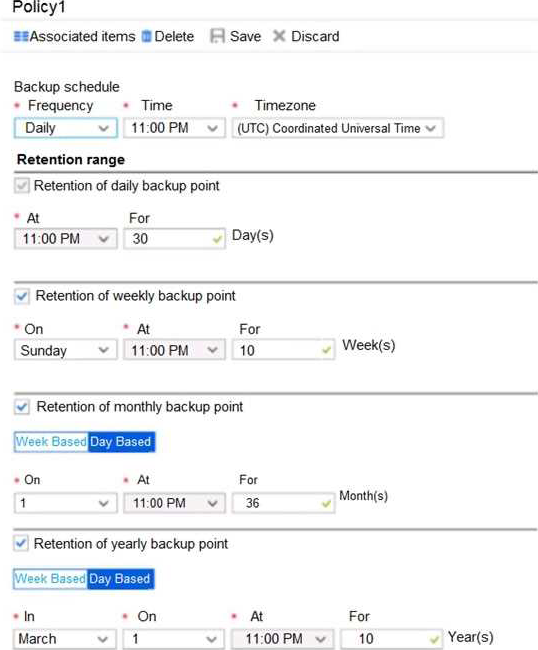 You create a Recovery Services vault backup policy named Policy1 as shown in the following exhibit.