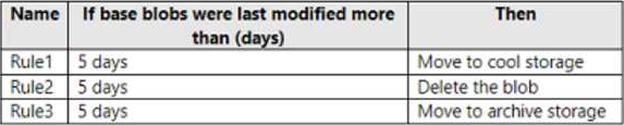 The subscription contains a storage account named storage1 that has the lifecycle management rules shown in the following table.