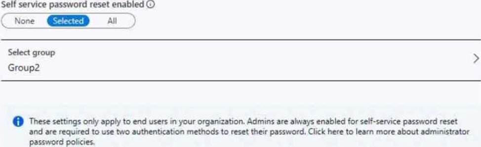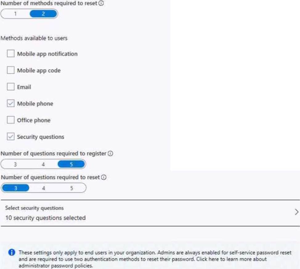 You configure the authentication methods for password reset as shown in the Authentication Methods exhibit. (Click the Authentication Methods tab.)