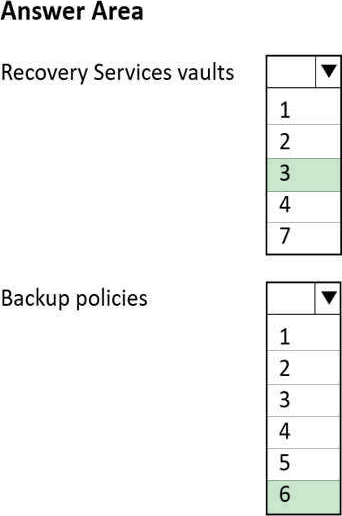 What is the minimum number of Recovery Services vaults and backup policies you should create? To answer, select the appropriate options in the answer area. NOTE: Each correct selection is worth one point.