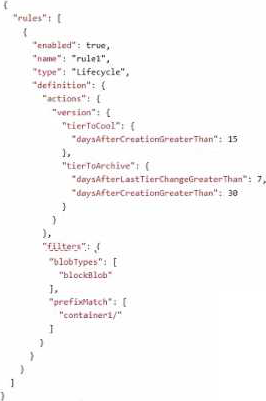The rule for container2 has an action that moves blob versions to the Archive access tier if they are older than 30 days and have a prefix match of “archive/”. Therefore, a blob version in container2 will only automatically move to the Archive access tier after 30 days if its name starts with “archive/”. Otherwise, it will remain in its current access tier.