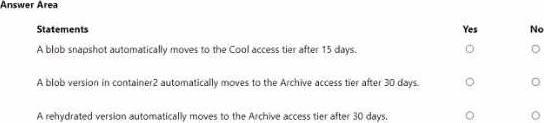 A blob version in container2 automatically moves to the Archive access tier after 30 days. = No