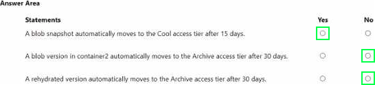 A blob version in container2 automatically moves to the Archive access tier after 30 days. = No