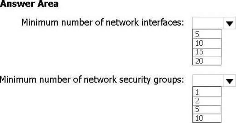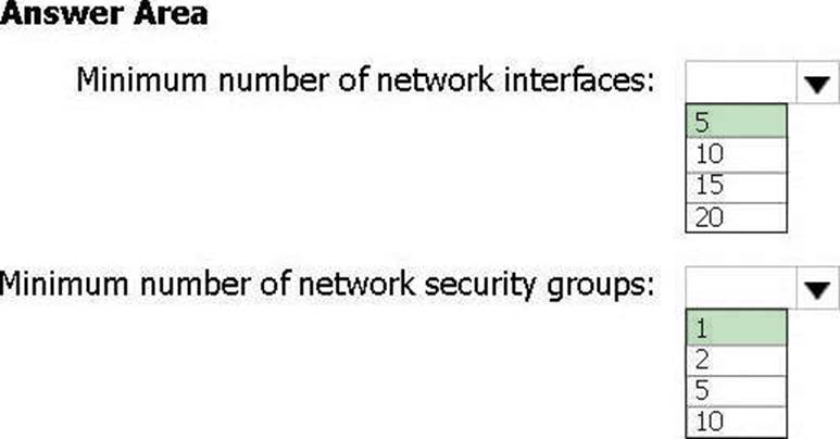 What is the minimum number of network interfaces and network security groups that you require? To answer, select the appropriate options in the answer area. NOTE: Each correct selection is worth one point.