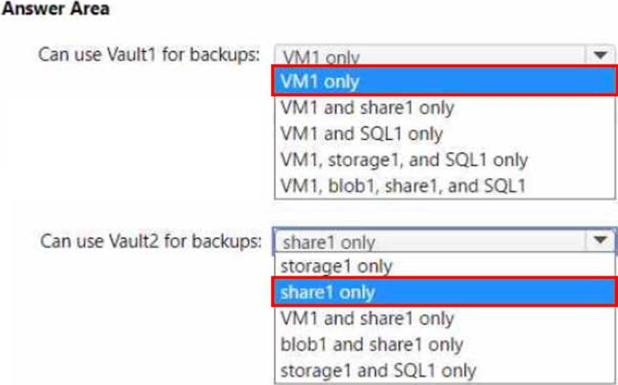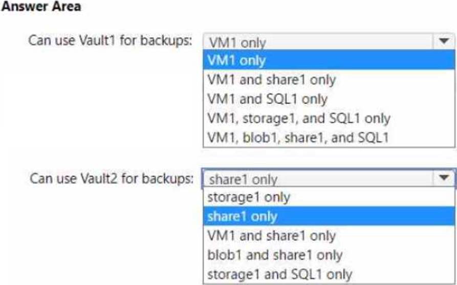 Which resources can be backed up to Vault1 and Vault2? To answer, select the appropriate options in the answer area. NOTE: Each correct selection is worth one point.