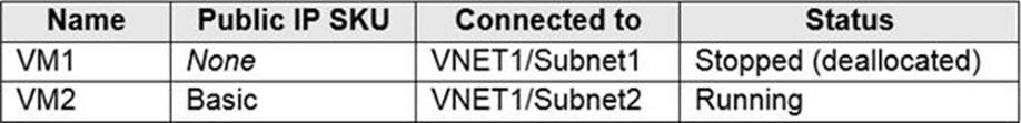 Solution: You create a Basic SKU public IP address, associate the address to the network interface of VM1, and then start VM1.