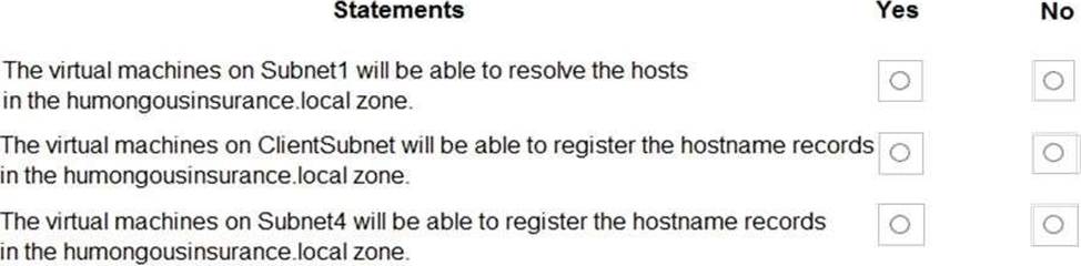 A virtual network named ClientResources-VNet that will contain one subnet named ClientSubnet You plan to create a private DNS zone named humongousinsurance.local and set the registration network to the ClientResources-VNet virtual network.