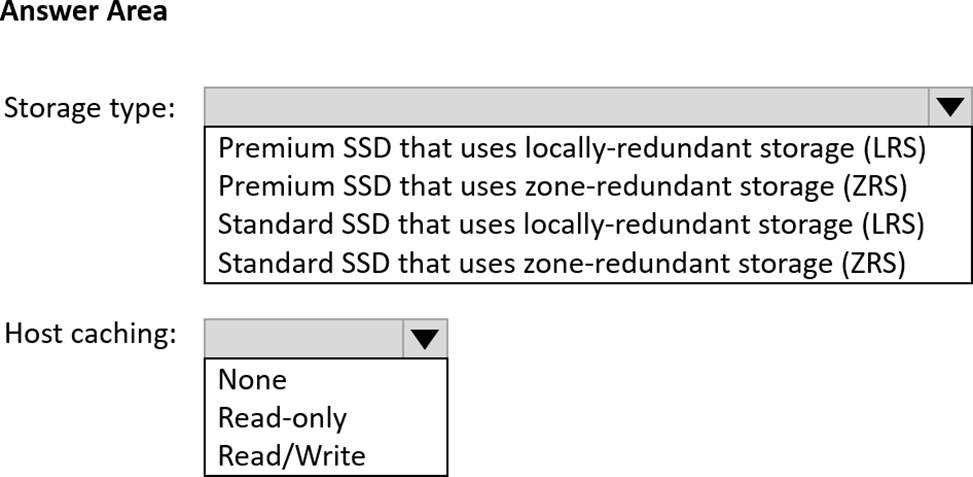 You need to recommend which type of storage and host caching to configure for the new data disk.