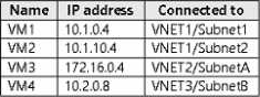 - D . Configure peering between VNET1, VNET2, and VNET3.