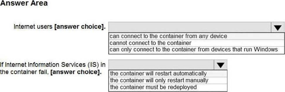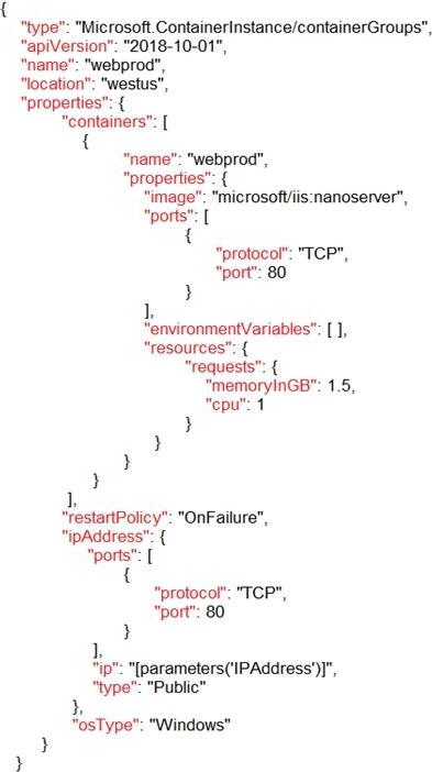 You plan to deploy an Azure container instance by using the following Azure Resource Manager template.