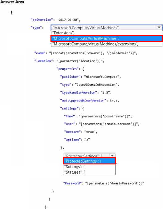 How should you complete the Azure Resource Manager (ARM) template? To answer, select the appropriate options in the answer area. NOTE Each correct selection is worth one point.