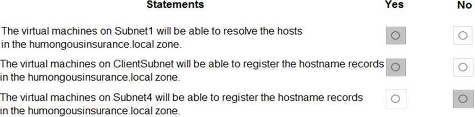 A virtual network named ClientResources-VNet that will contain one subnet named ClientSubnet You plan to create a private DNS zone named humongousinsurance.local and set the registration network to the ClientResources-VNet virtual network.