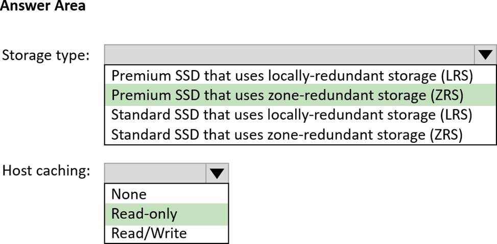 You need to recommend which type of storage and host caching to configure for the new data disk.