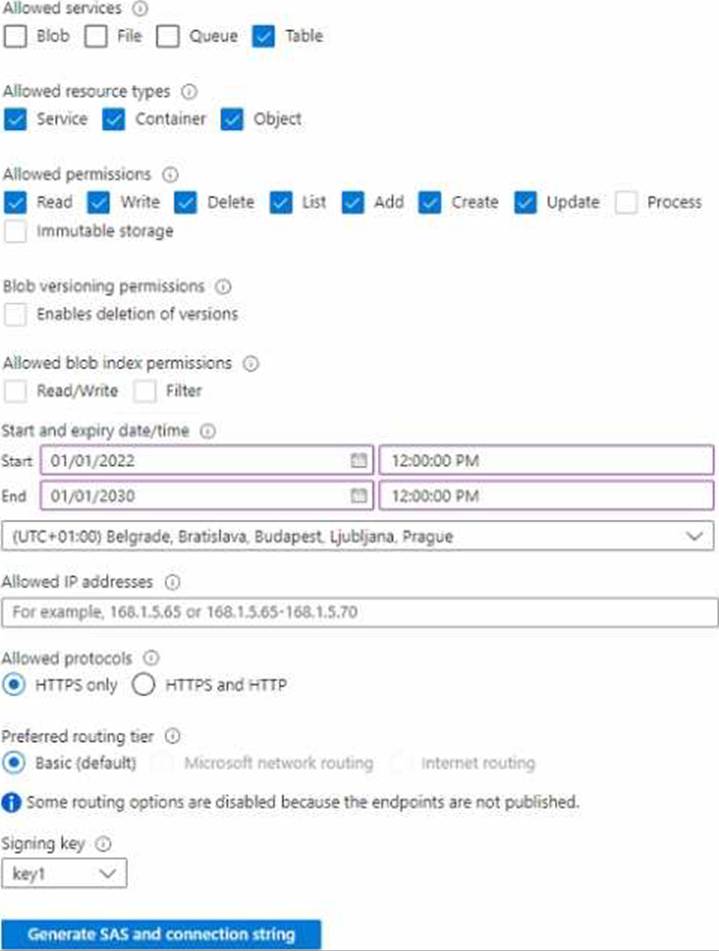 For storage1, you create a shared access signature (SAS) named SAS1 that has the settings shown in the following exhibit. (Click the Exhibit tab.)