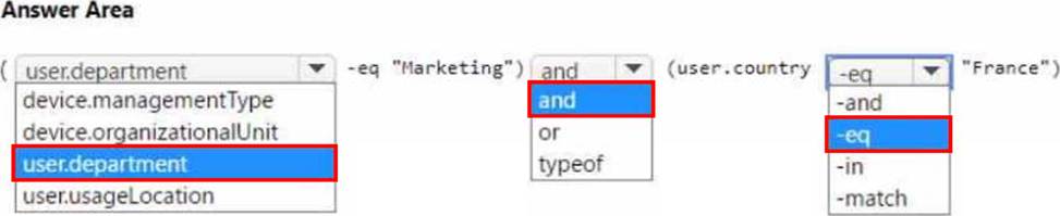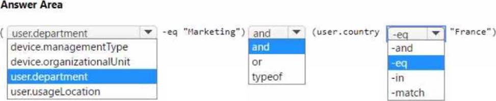 How should you complete the dynamic membership rule? To answer, select the appropriate options in the answer area. NOTE: Each correct answer is worth one point.
