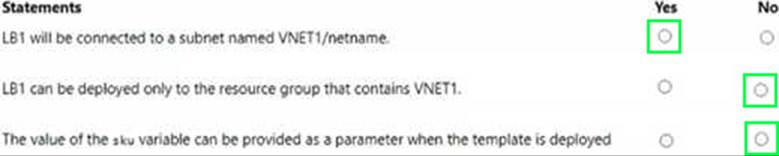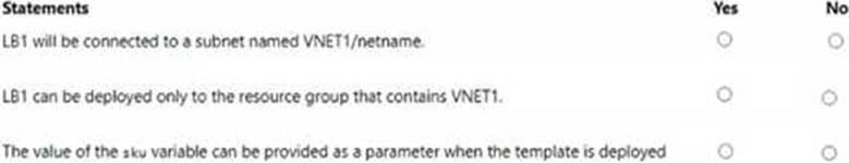 LB1 can be deployed only to the resource group that contains VNET1. No, this is not correct. The template does not specify a resource group for the load balancer resource, which means it can be deployed to any resource group in the same subscription as VNET1. However, if you want to deploy the load balancer to a specific resource group, you can add a property called resource Group to the reference of the subnet in line 382.
