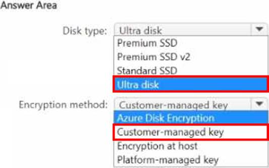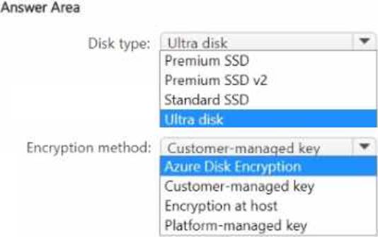 Which disk type and encryption method should you use? To answer, select the appropriate options in the answer area. NOTE: Each correct selection is worth one point.
