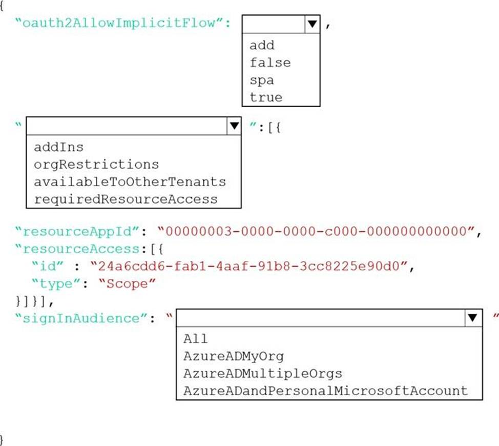 How should you complete the manifest? To answer, select the appropriate options in the answer area. NOTE: Each correct selection is worth one point.