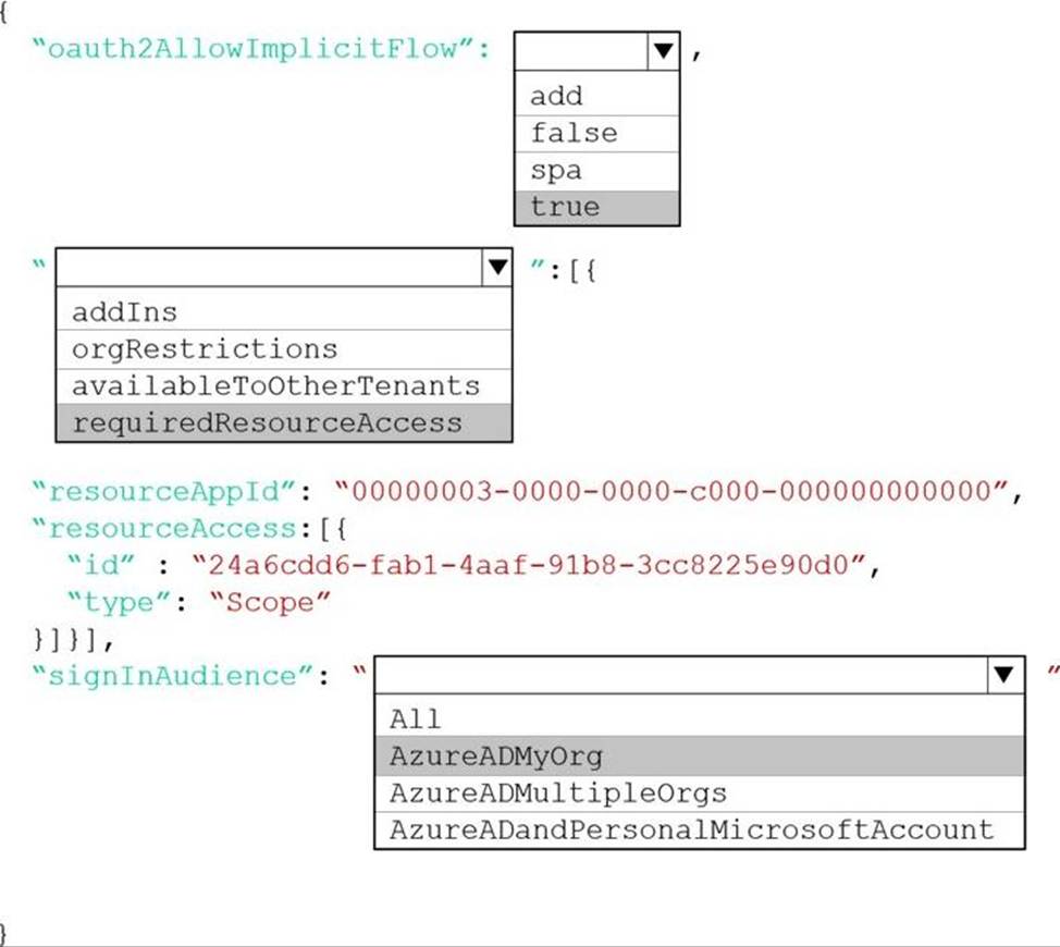 How should you complete the manifest? To answer, select the appropriate options in the answer area. NOTE: Each correct selection is worth one point.