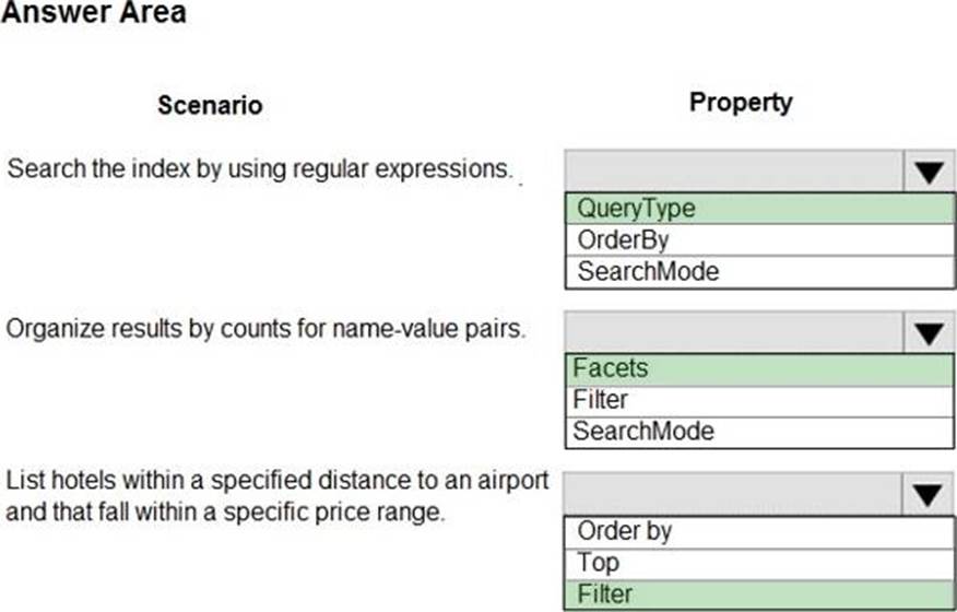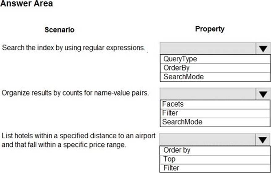 You are developing a .NET Core MVC application for customers to research hotels. The application will use Azure Search. The application will search the index by using various criteria to locate documents related to hotels. The index will include search fields for rate, a list of amenities, and distance to the nearest airport.