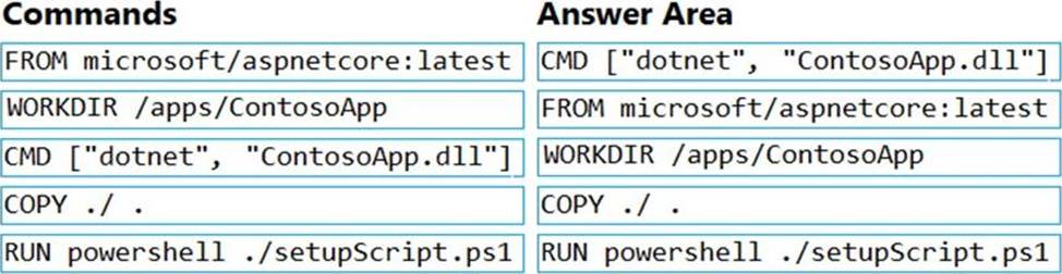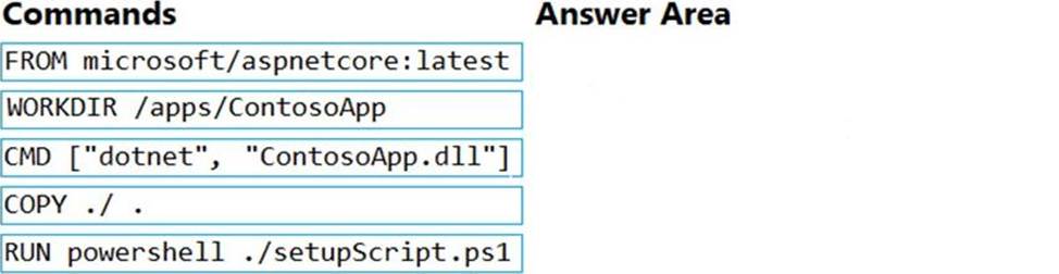 You plan to create a Docker image that runs an ASP.NET Core application named ContosoApp. You have a setup script named setupScript.ps1 and a series of application files including ContosoApp.dll.