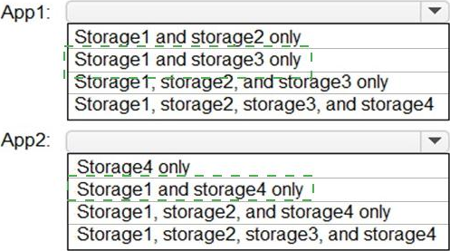 Which storage accounts should you recommend using for each app? To answer, select the appropriate options in the answer area. NOTE: Each correct selection is worth one point.
