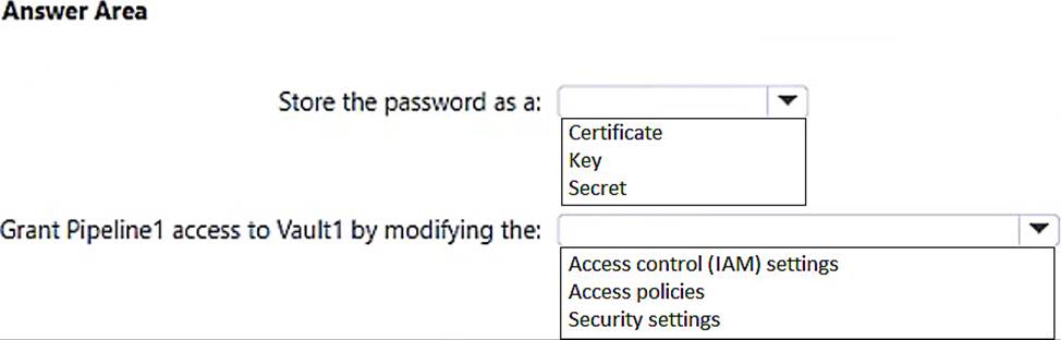 You need to store the password in Vault1. The solution must ensure that the password can be accessed by Pipeline1.