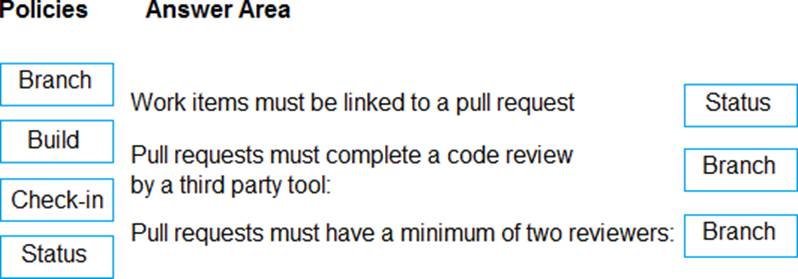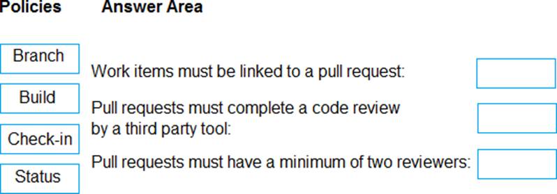 Which type of policy should you use for each requirement? To answer, drag the appropriate policy types to the correct requirements. Each policy type may be used once, more than once, or not at all. You may need to drag the split bar between panes or scroll to view content.